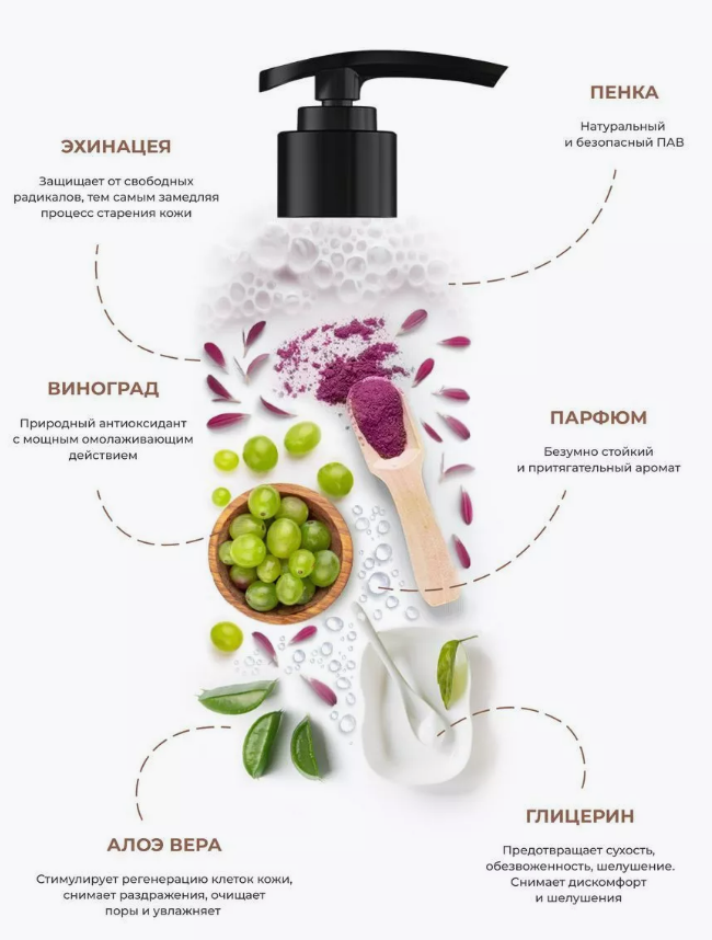 Aqua, Coсamidopropyl betaine, Sodium benzoate, Citric acid, Glycerin, Sodium lauryl sarcosinate, Parfum, Chereonman, Coco Glucoside, D-panthenol, СО2 Aloe vera extract, СО2 Pyrus malus fruit extract, СО2 Vitis vinifera extract, СО2 Echinacea purpurea extract, СО2 Аrctium lappa root extract.
