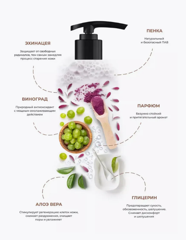 Aqua, Coсamidopropyl betaine, Sodium benzoate, Citric acid, Glycerin, Sodium lauryl sarcosinate, Parfum, Chereonman, Coco Glucoside, D-panthenol, СО2 Aloe vera extract, СО2 Pyrus malus fruit extract, СО2 Vitis vinifera extract, СО2 Echinacea purpurea extract, СО2 Аrctium lappa root extract.