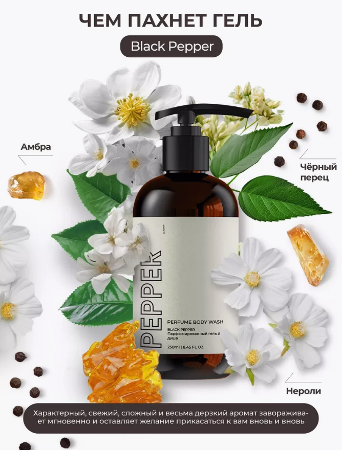 Парфюмированный гель для душа PEPPER мягко очищает кожу и позволяет насладиться деликатным ароматным шлейфом, оставленным на ней. Нежная питательная пена с тонким ароматом чёрного перца, нотами амбры и нероли мягко очищает лицо и тело. Формула геля обогащена уникальным комплексом с AHA-кислотами и экстрактами яблока, эхинацеи и алоэ-вера. Эти ценные компоненты превращаются в нежную атласную пену при контакте с водой, мгновенно окутывая Вашу кожу заботой и нежностью.